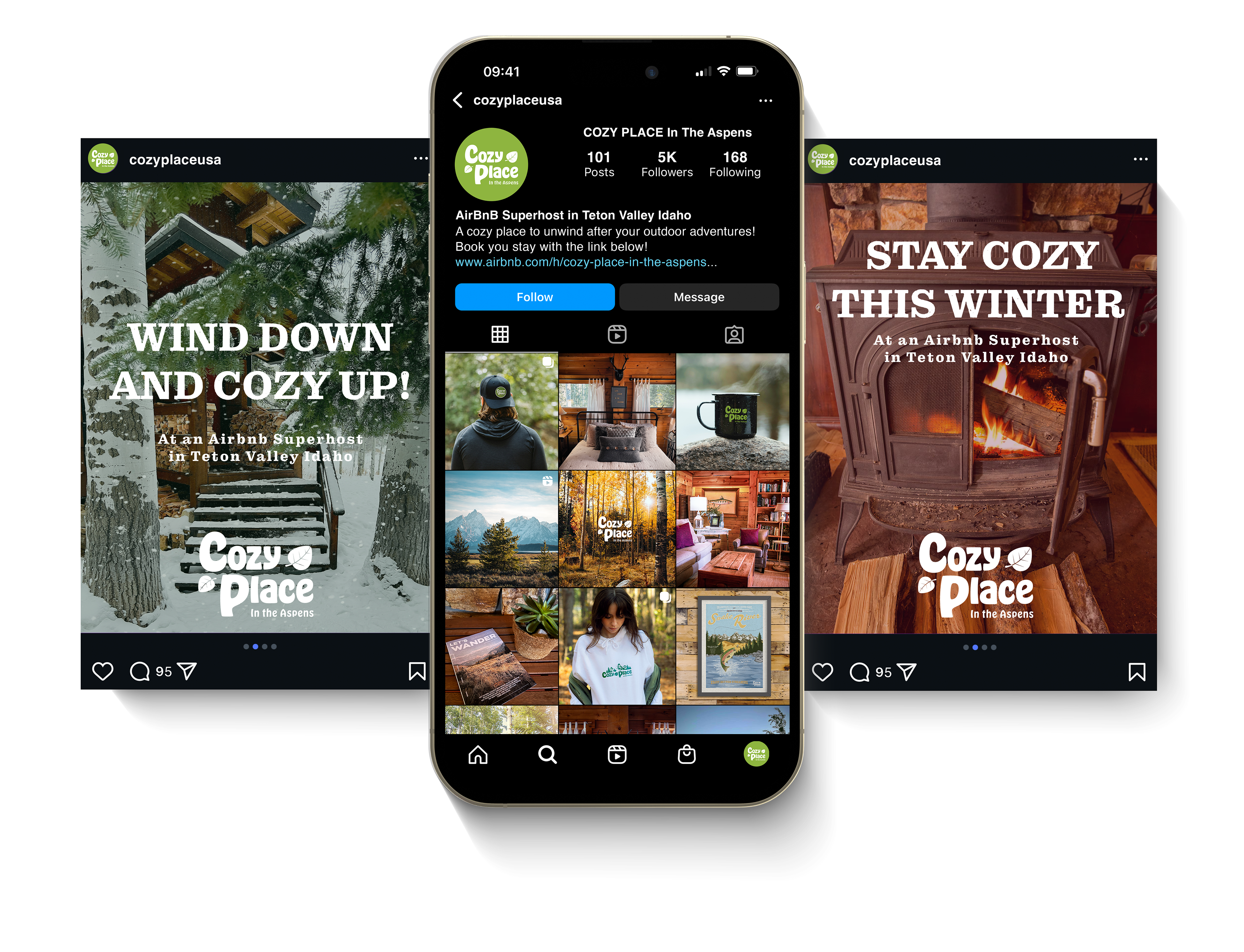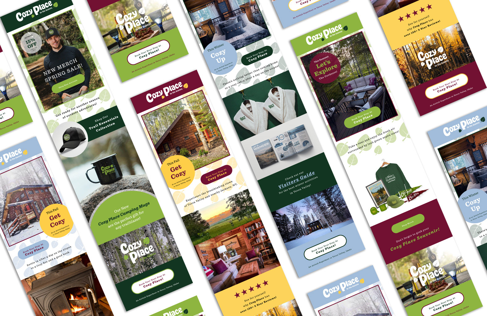 Cozy Place in the Aspens is an Airbnb Superhost located in Teton Valley Idaho with over 150 five-star reviews. This cozy mountain home is nestled in the Targhee National Forest, with backyard view of the Teton Mountains. As the lead brand designer on this project, I developed a logo and brand identity that distinguished Cozy Place from the other 350+ Airbnbs in the area. I also built social and email campaigns, and designed print collateral and merchandise to provide guests with souvenirs from their stay.