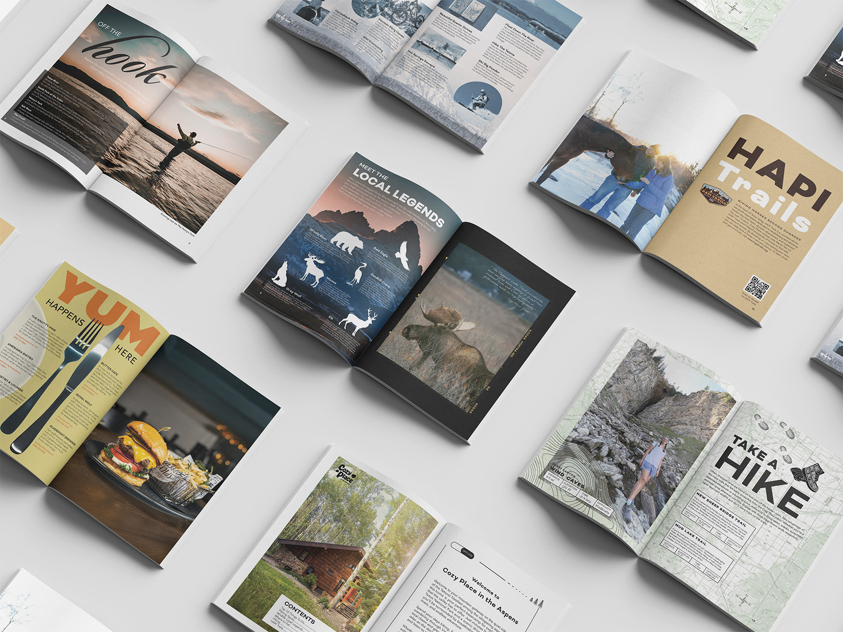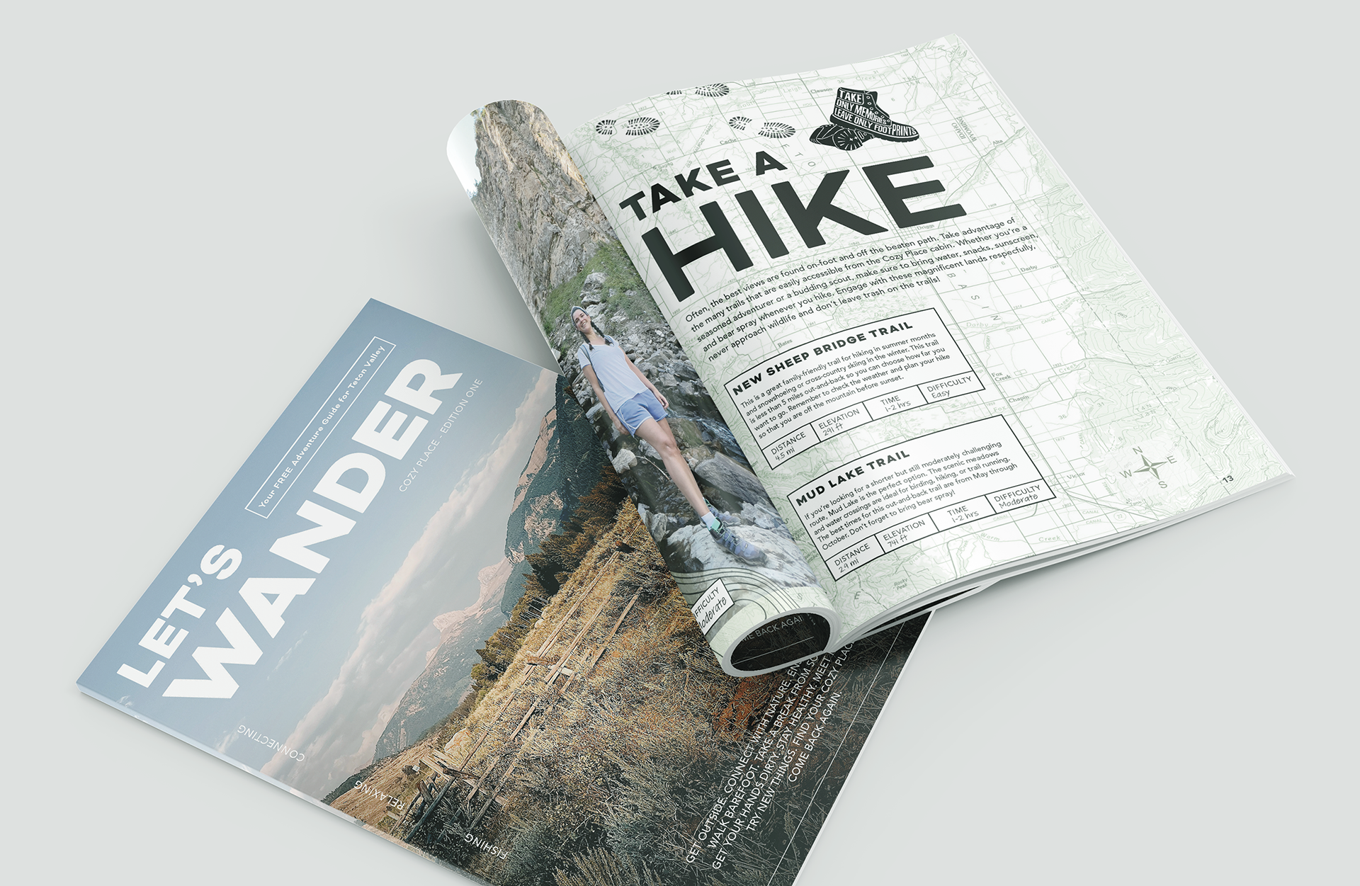 Most Airbnbs offer a basic "visitors guide" in the form of a plastic folder filled with printouts of local restaurants and activities. At Cozy Place, we wanted to provide guests with a much more engaging experience that they could take with them after their stay. I designed a 16-page mini zine filled with relevant visitor information and eye-catching snapshots of Teton Valley. I used Newspaper Club to print these zines and guests are encouraged to take them home as a memento from their trip.