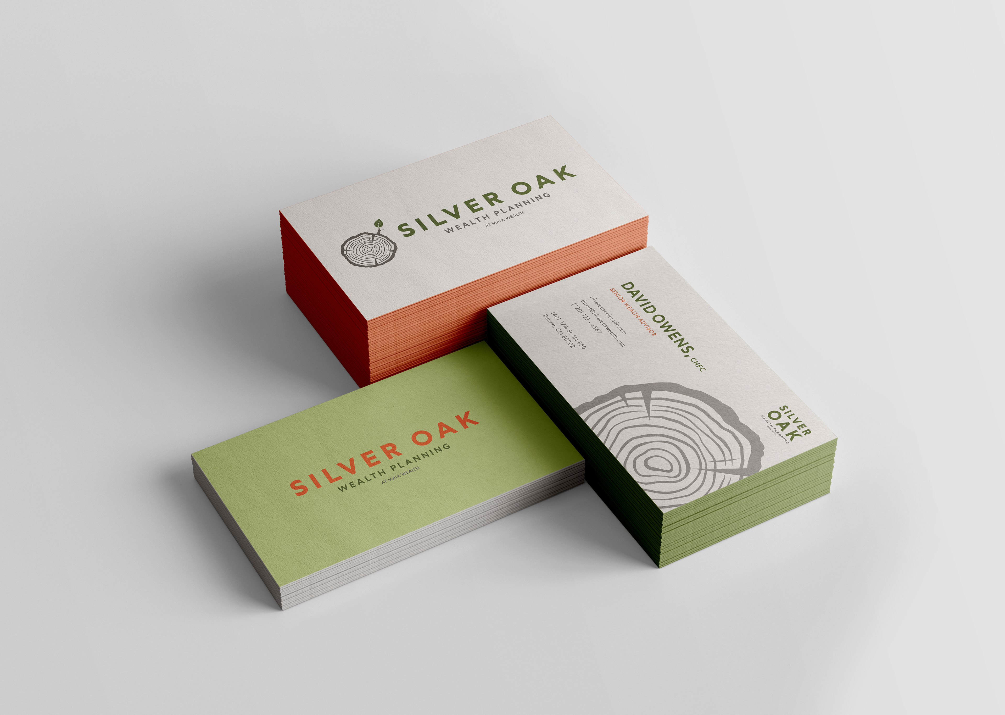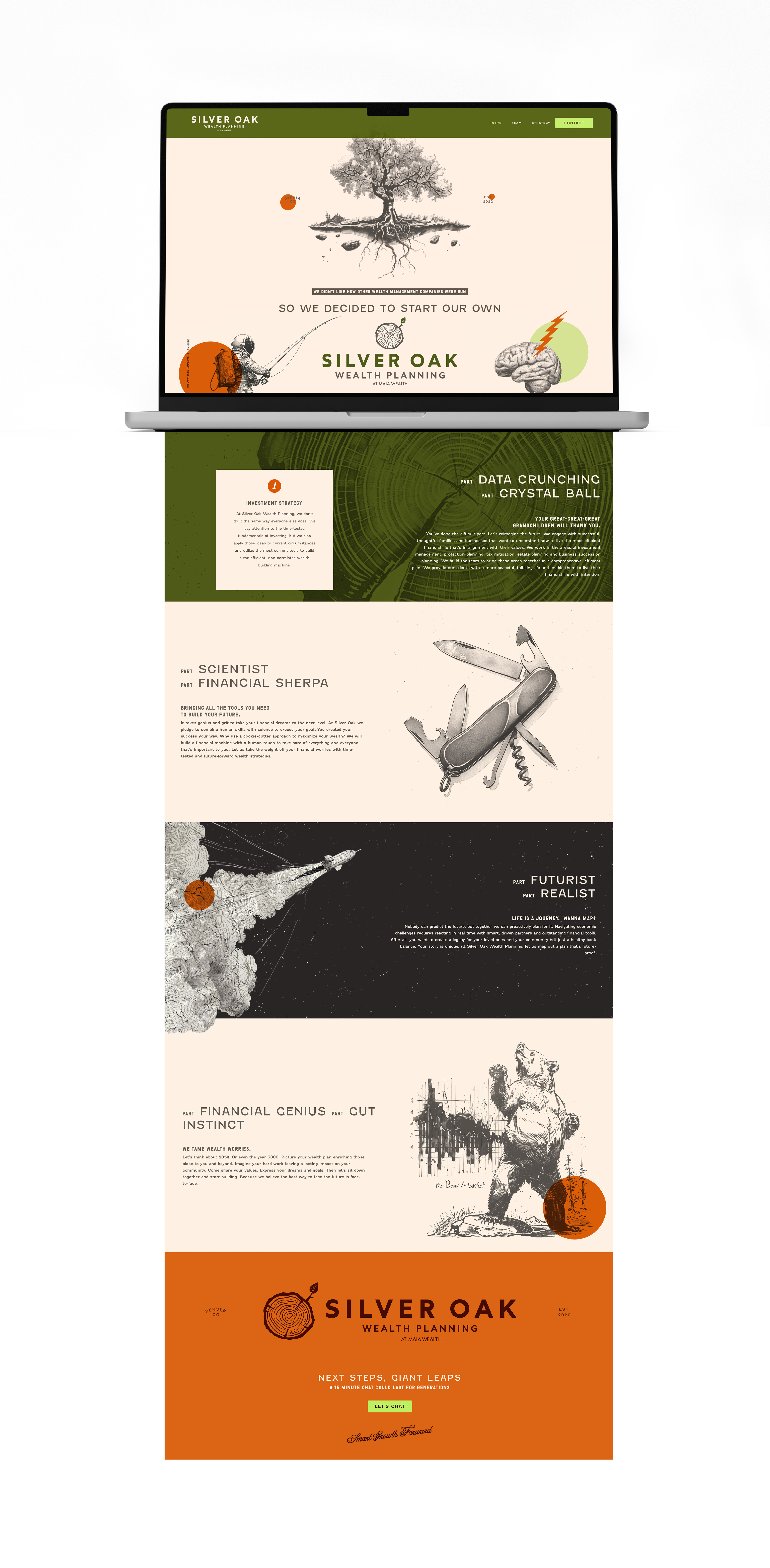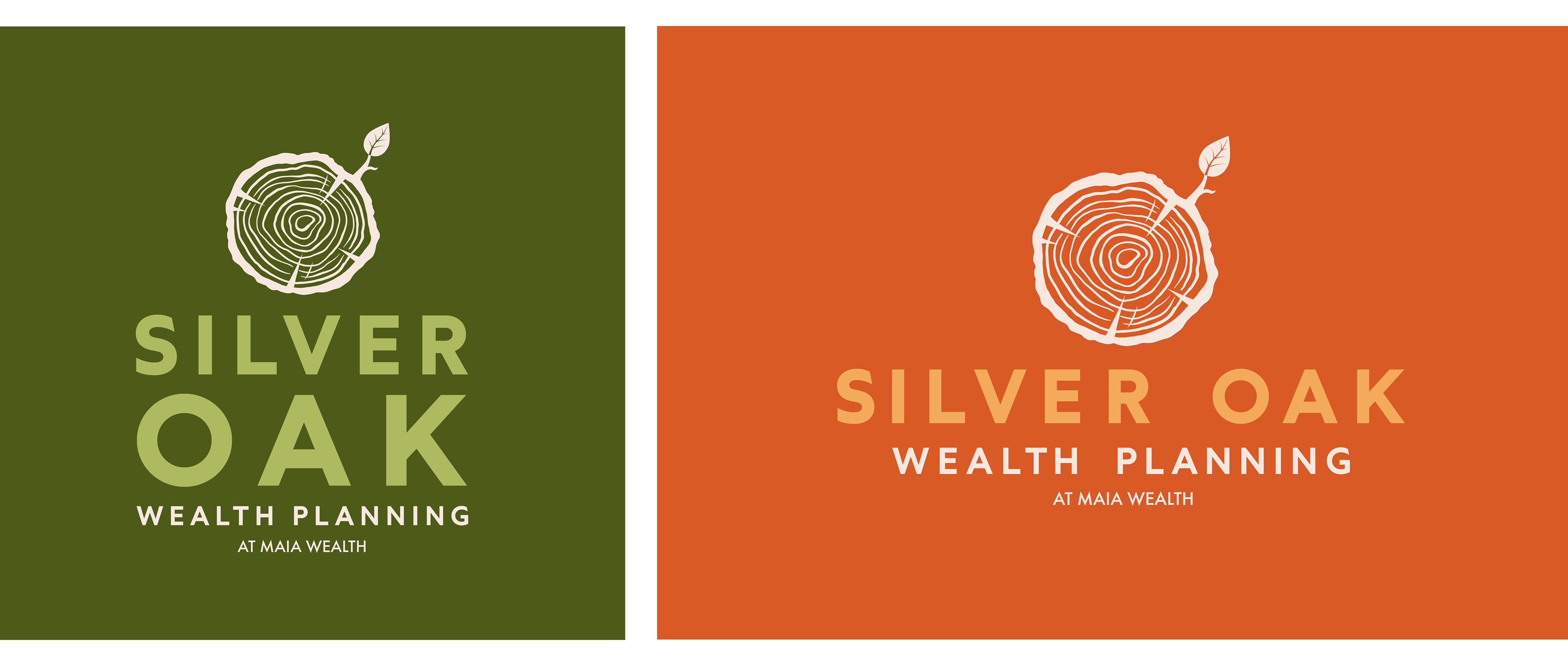 My goal was to craft a visual identity that felt unexpected for a financial firm, with a nod to the outdoorsy interests of the founders. I built this brand around the company's namesake, the oak tree, a symbol of enduring strength, longevity, and wisdom. The tree rings in the logo mark acknowledge the time it takes to build wealth, and the importance of planning for the future. Just like the trunk of a tree, Silver Oak provides stable, strategic growth so that their clients can branch out and enjoy the fruits of their labor for generations to come.
