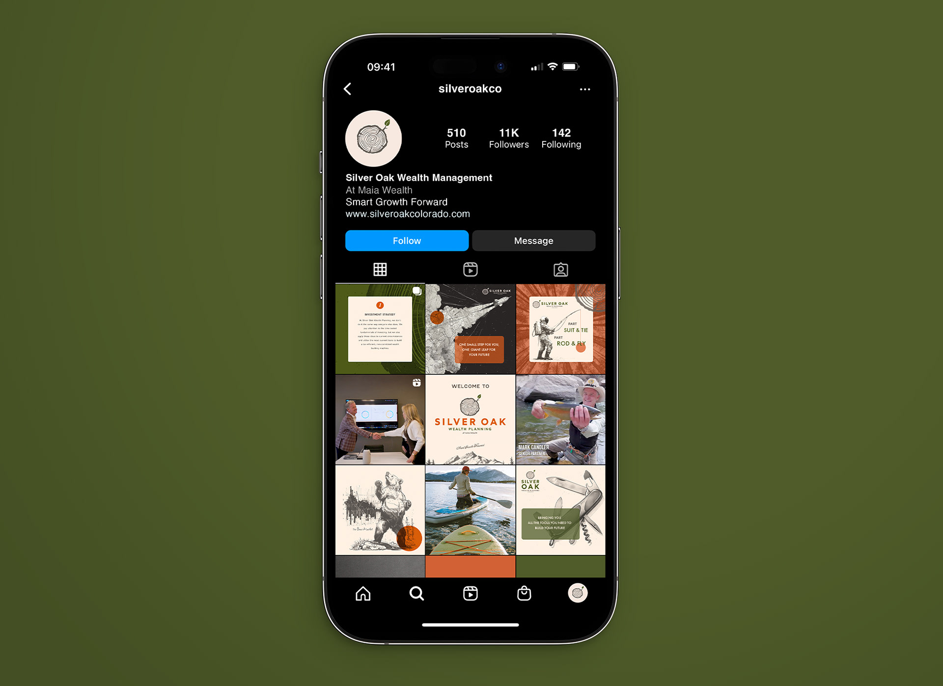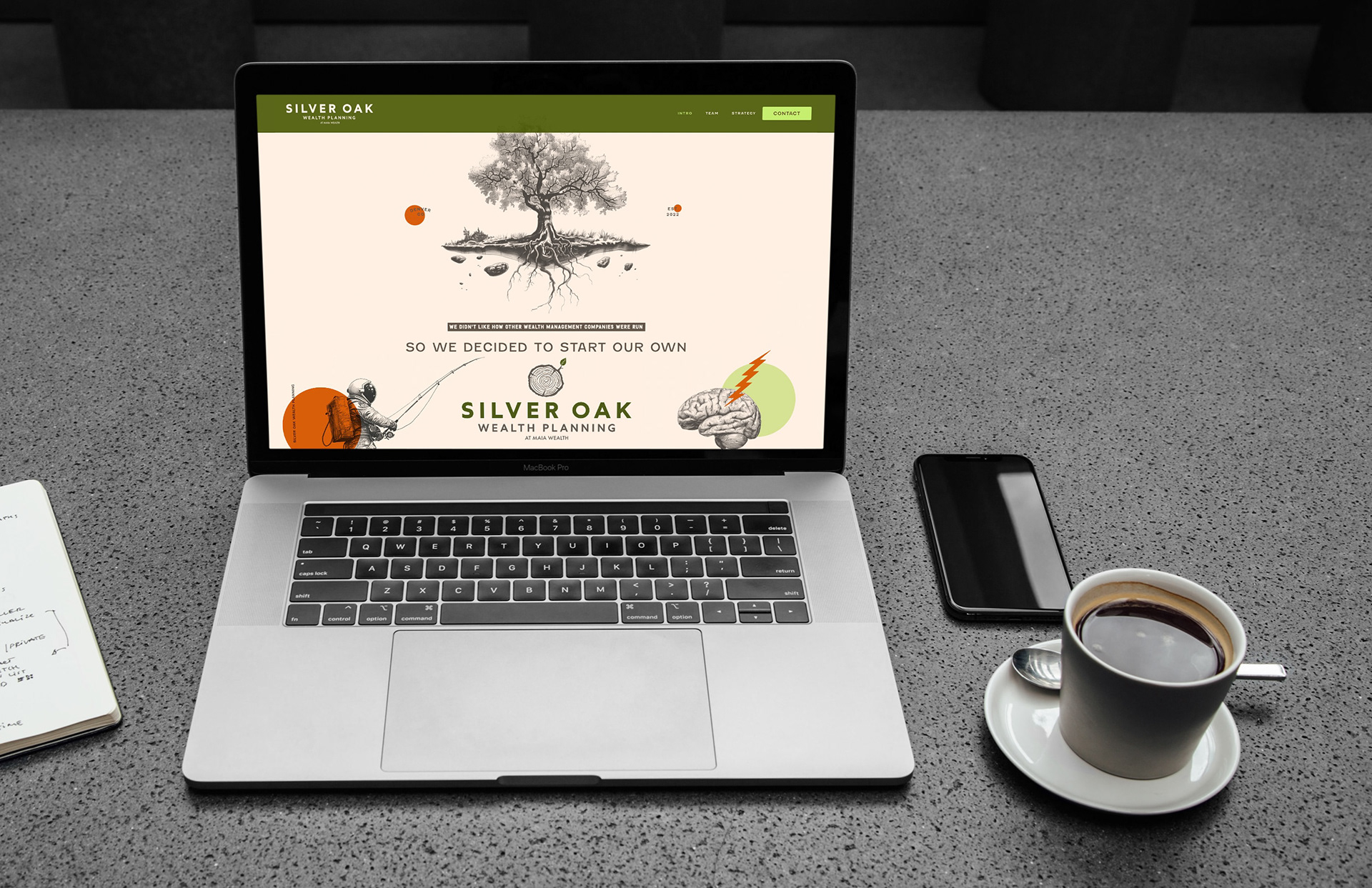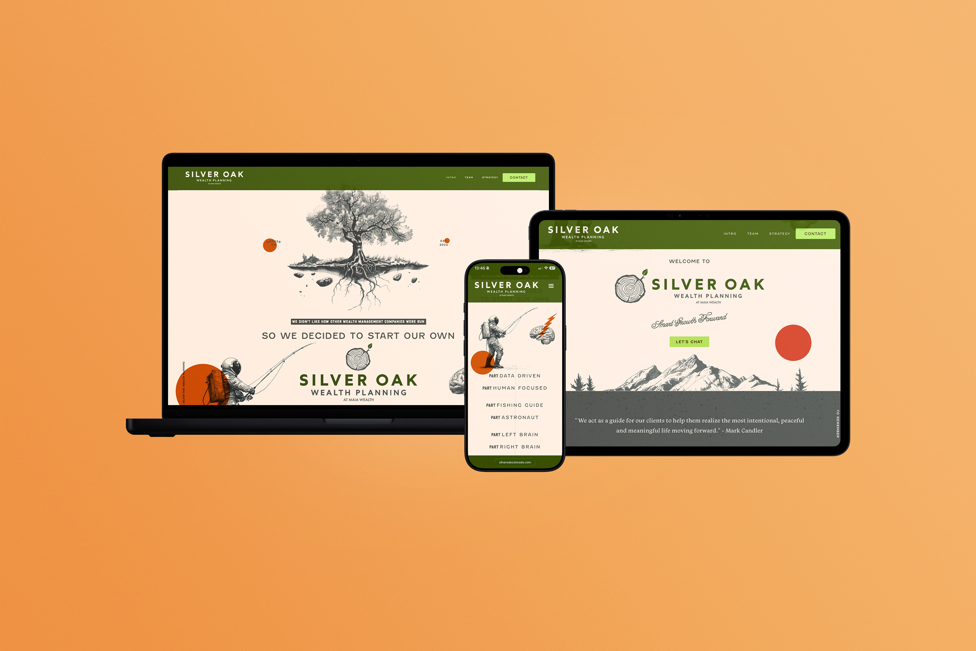 My goal was to craft a visual identity that felt unexpected for a financial firm, with a nod to the outdoorsy interests of the founders. I built this brand around the company's namesake, the oak tree, a symbol of enduring strength, longevity, and wisdom. The tree rings in the logo mark acknowledge the time it takes to build wealth, and the importance of planning for the future. Just like the trunk of a tree, Silver Oak provides stable, strategic growth so that their clients can branch out and enjoy the fruits of their labor for generations to come.